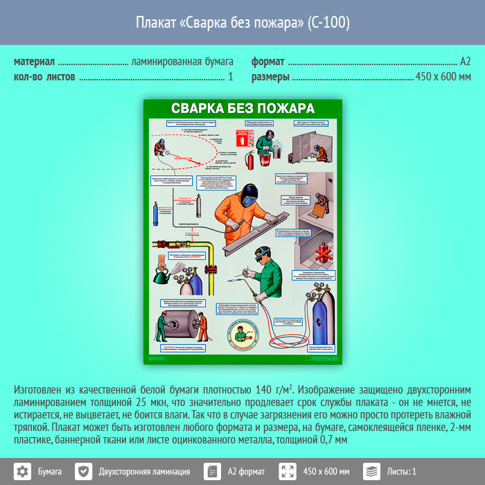 Плакат «Сварка без пожара» (С-100, ламинированная бумага, А2, 1 лист) в Щёлково купить