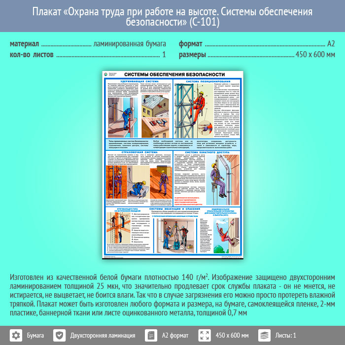 Плакат «Охрана труда при работе на высоте. Системы обеспечения безопасности» (С-101, ламинированная бумага, А2, 1 лист) в Щёлково купить