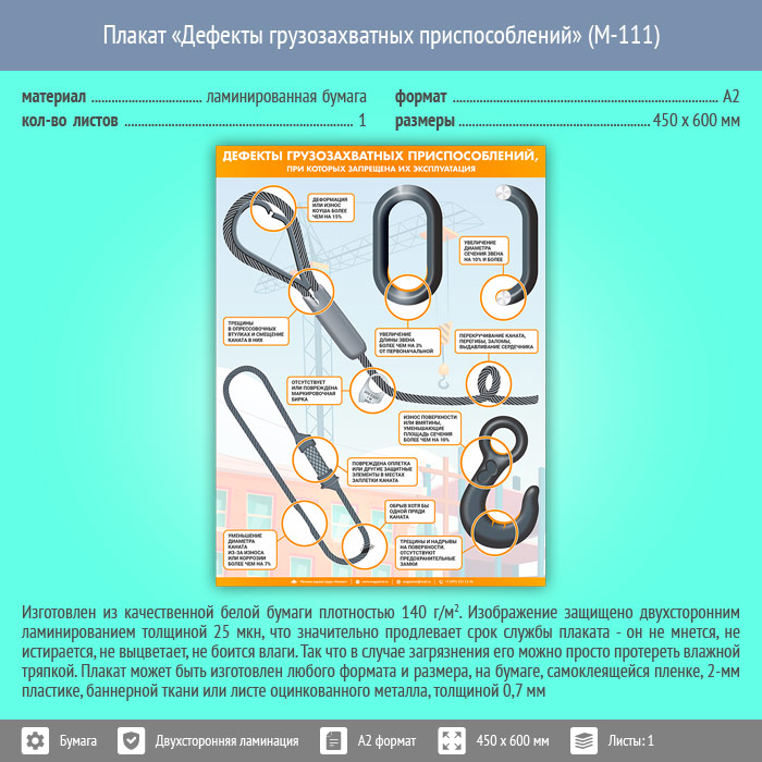 Плакат «Дефекты грузозахватных приспособлений» (М-111, ламинированная бумага, А2, 1 лист) в Щёлково купить