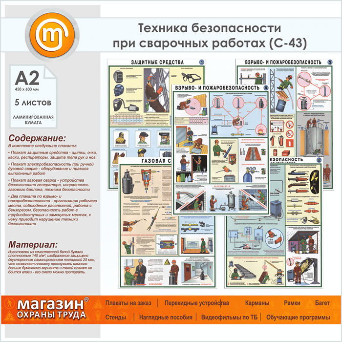Плакаты «Техника безопасности при сварочных работах» (С-43, ламинированная бумага, А2, 5 листов) в Щёлково купить