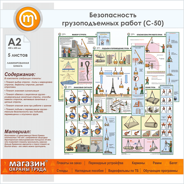 Плакаты «Безопасность грузоподъемных работ» (С-50, ламинированная бумага, А2, 5 листов) в Щёлково купить