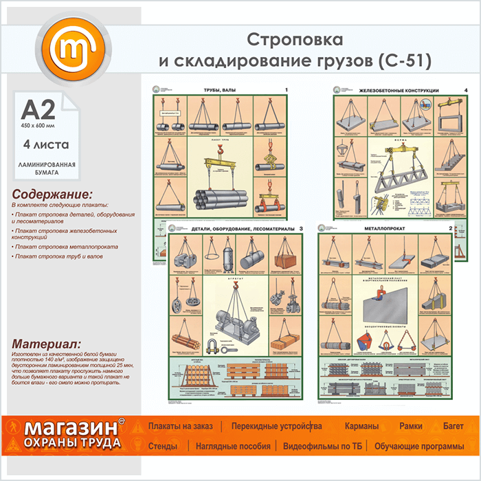 Плакаты «Строповка и складирование грузов» (С-51, ламинированная бумага, А2, 4 листа) в Щёлково купить