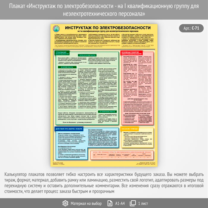 Плакат «Инструктаж по электробезопасности - на I квалификационную группу для неэлектротехнического персонала» (С-71, 1 лист) в Щёлково купить