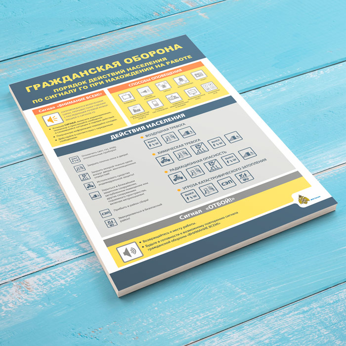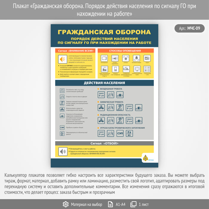 Плакат «Гражданская оборона. Порядок действия населения по сигналу ГО при нахождении на работе» (МЧС-09, 1 лист) в Щёлково купить