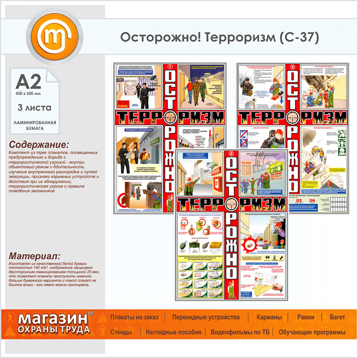Плакаты «Осторожно! Терроризм» (С-37, ламинированная бумага, А2, 3 листа) в Щёлково купить