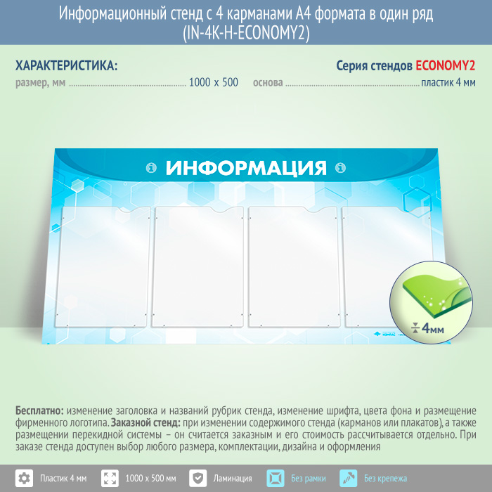 Информационный стенд с 4 карманами А4 формата в один ряд (IN-4K-H-ECONOMY2) в Щёлково купить