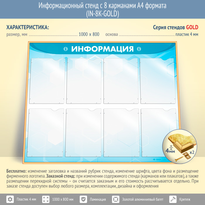 Информационный стенд с 8 карманами А4 формата (IN-8K-GOLD) в Щёлково купить