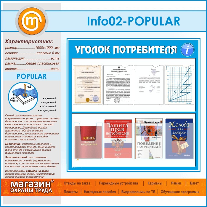 Стенд «Уголок потребителя» с 4 плоскими и 4 объемными карманами А4 формата (IN-02-POPULAR) в Щёлково купить