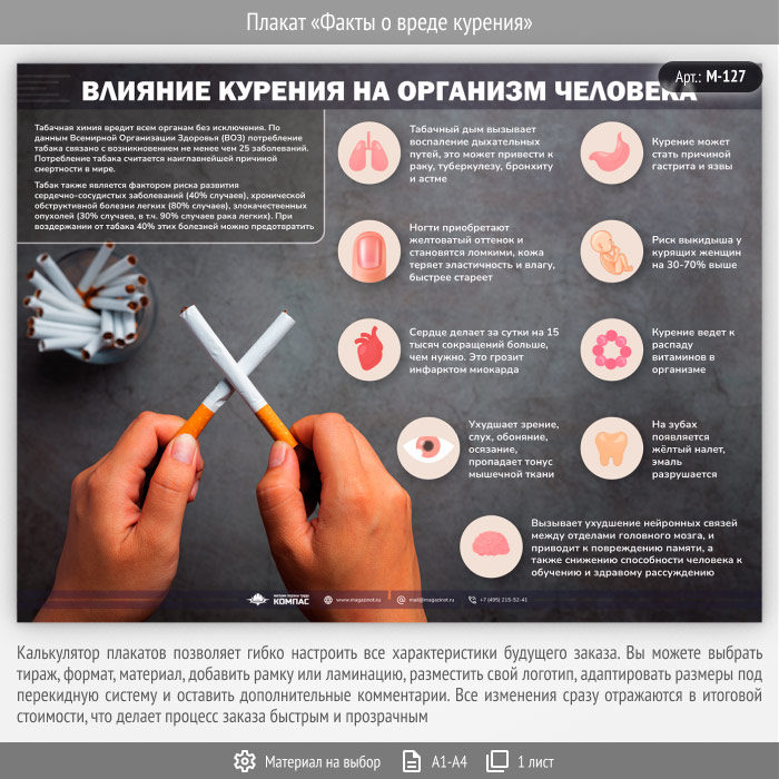 Плакат «Факты о вреде курения» (М-127, 1 лист) в Щёлково купить