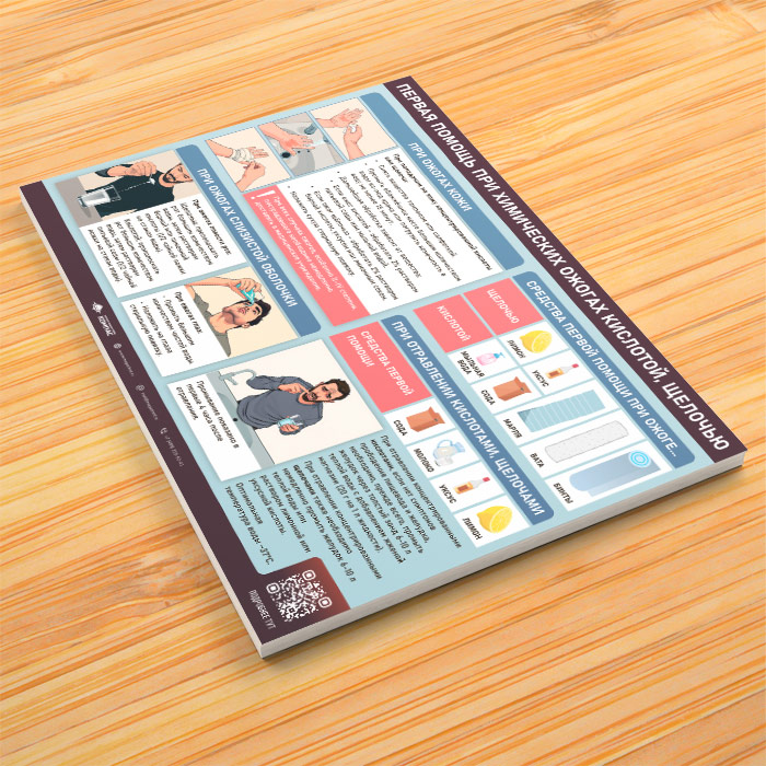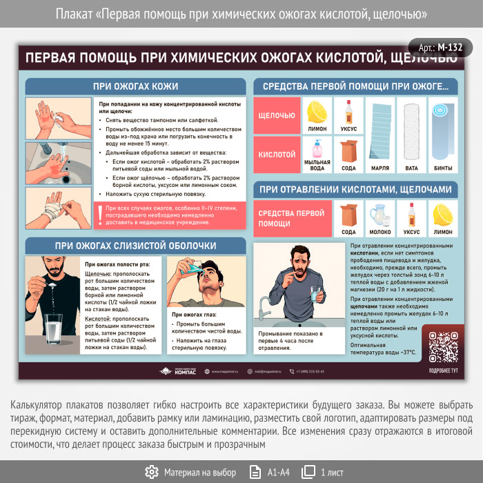 Плакат «Первая помощь при химических ожогах кислотой, щелочью» с QR (М-132, 1 лист) в Щёлково купить