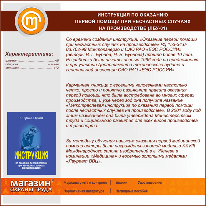 Инструкция по оказанию первой помощи при несчастных случаях на производстве (ЛБУ-01) в Щёлково купить