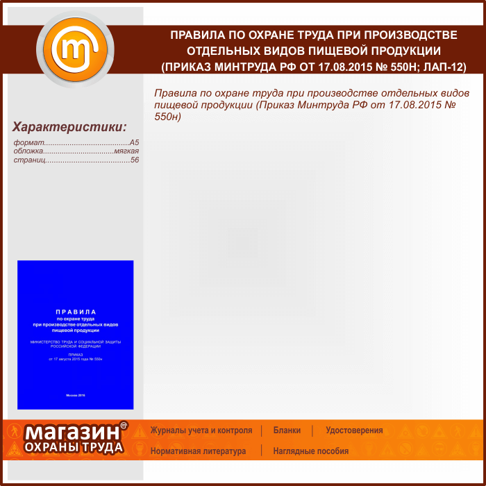 Правила по охране труда при производстве отдельных видов пищевой продукции (Приказ Минтруда РФ от 17.08.2015 № 550н) (ЛАП-12) в Щёлково купить