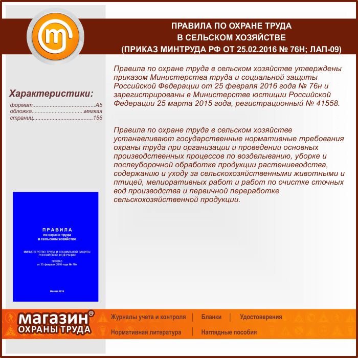 Правила по охране труда в сельском хозяйстве (Приказ Минтруда РФ от 25.02.2016 № 76н) (ЛАП-09) в Щёлково купить