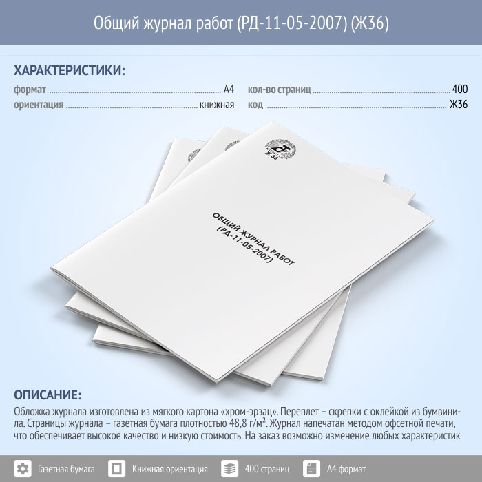 Заказывая Общий журнал работ у нас, Вы можете выбрать любое исполнение обложки и количество страниц в нем. Согласно правилам, страницы журнала прошнуровываются и пронумеровываются. Оставшаяся часть шнура приклеивается к последней странице частью листа бумаги, на котором указывается количество страниц. Все скрепляется печатью организации и подписывается ответственным должностным лицом, ведущим учет журналов
