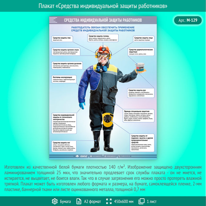 Плакат «Средства индивидуальной защиты работников» (М-129, ламинированная бумага, А2, 1 лист) в Щёлково купить