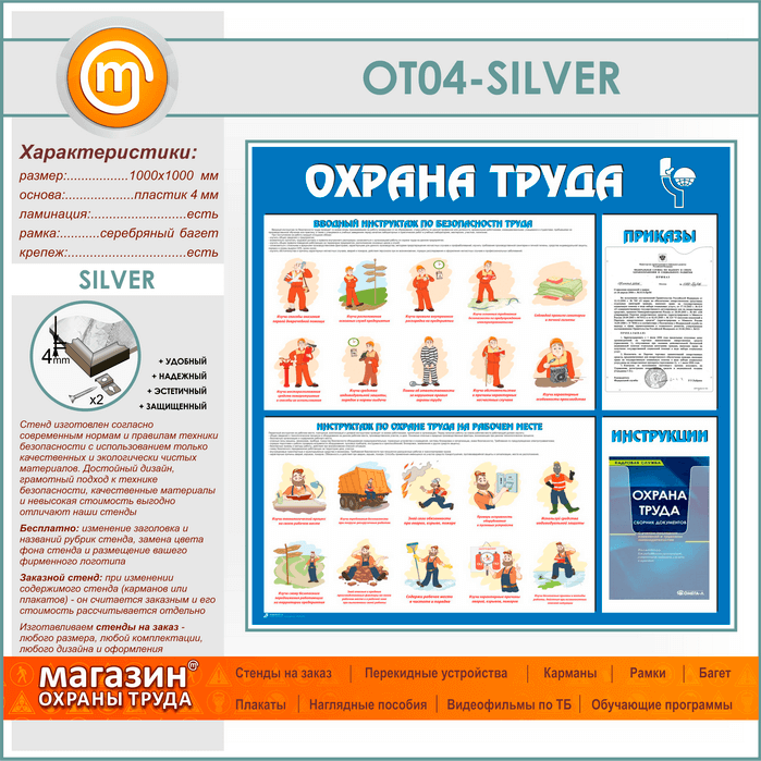 Стенд «Охрана труда» с плоским и объемным карманами (OT-04-SILVER) в Щёлково купить