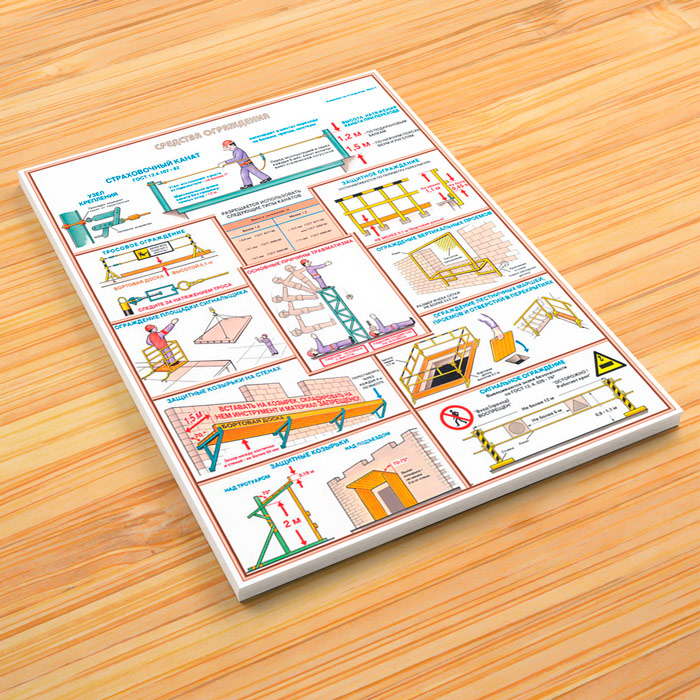- Плакат «Средства ограждения»: страховочный канат и тросовое ограждение, защитное ограждение и ограждение вертикальных проемов, защитные козырьки на стенах и сигнальные ограждения