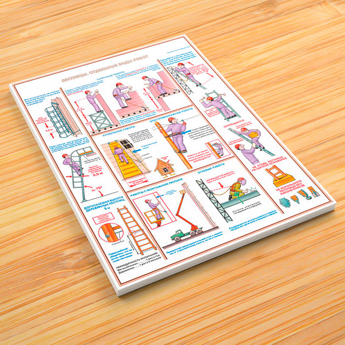 - Плакат «Лестница и отдельные виды работ»: техника безопасности работы на лестнице, а также безопасность при выполнении каменных, огневых, кровельных и электромонтажных работ