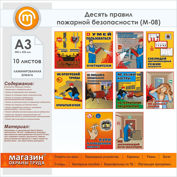 Плакаты «Десять правил пожарной безопасности» (М-08, ламинированная бумага, А3, 10 листов) в Щёлково купить