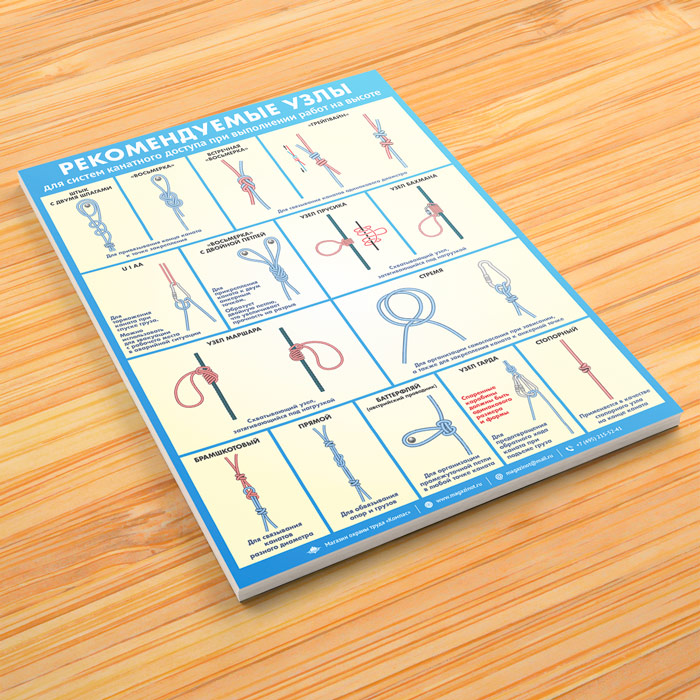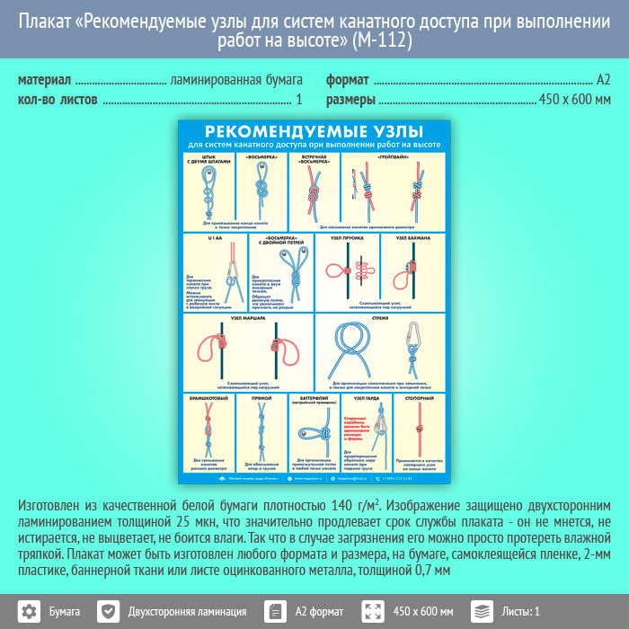 Плакат «Рекомендуемые узлы для систем канатного доступа при выполнении работ на высоте» (М-112, ламинированная бумага, А2, 1 лист) в Щёлково купить
