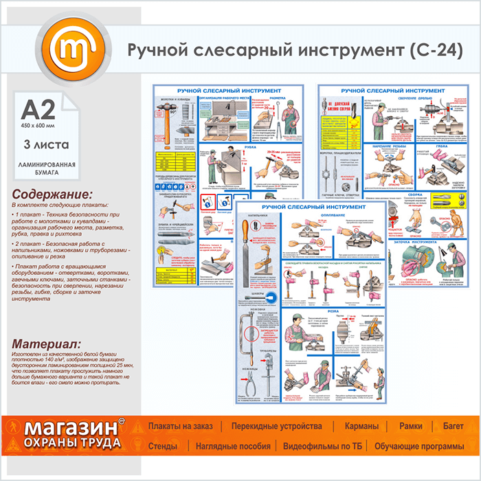 Плакаты «Ручной слесарный инструмент» (С-24, ламинированная бумага, А2, 3 листа) в Щёлково купить