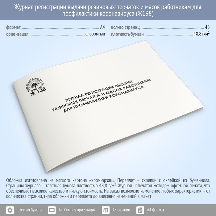Журнал регистрации выдачи резиновых перчаток и масок работникам для профилактики коронавируса (48 стр., Ж138) в Щёлково купить