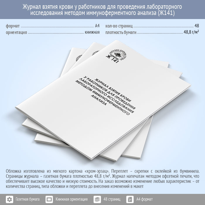 Журнал взятия крови у работников для проведения лабораторного исследования методом иммуноферментного анализа (48 стр., Ж141) в Щёлково купить