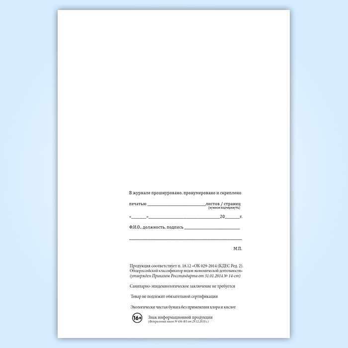 Вы получаете печатную продукцию прошнурованной и c местом для вашей печати в соответствии с действующими нормативными документами: