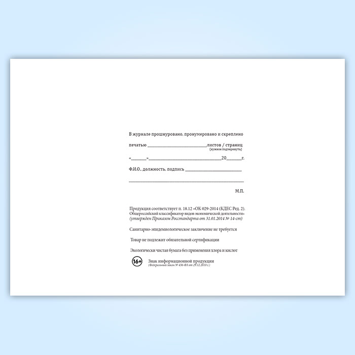 Вы получаете печатную продукцию прошнурованной и c местом для вашей печати в соответствии с действующими нормативными документами: