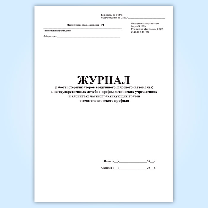Журнал работы стерилизаторов воздушного, парового (автоклава) в негосударственных лечебно-профилактических учреждениях и кабинетах частнопрактикующих врачей стоматологического профиля (форма 257/у) в Щёлково купить