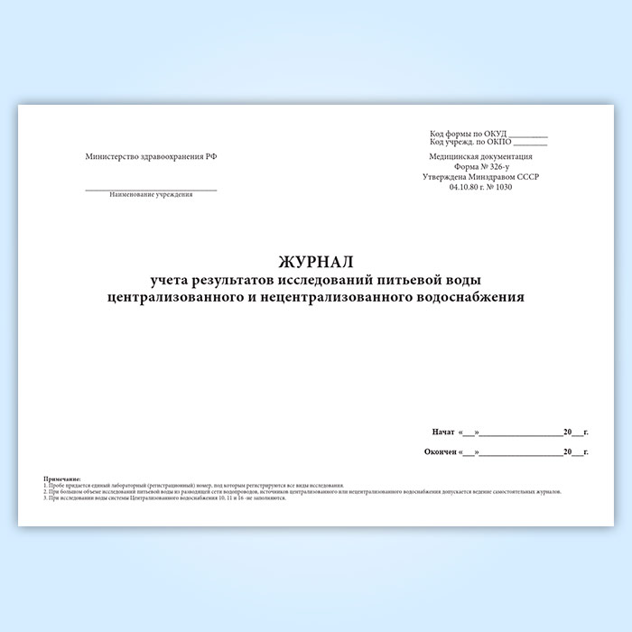 Журнал учета результатов исследований питьевой воды централизованного и нецентрализованного водоснабжения (форма 326-у) в Щёлково купить