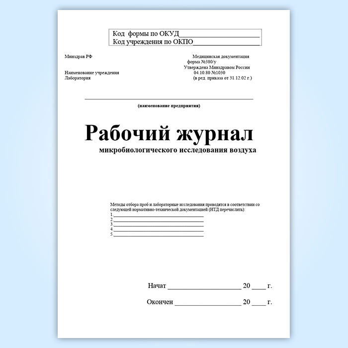 Рабочий журнал микробиологического исследования воздуха (форма 380/у) в Щёлково купить