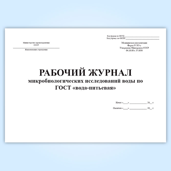 Рабочий журнал микробиологических исследований воды по ГОСТ вода-питьевая (форма 383/у) в Щёлково купить