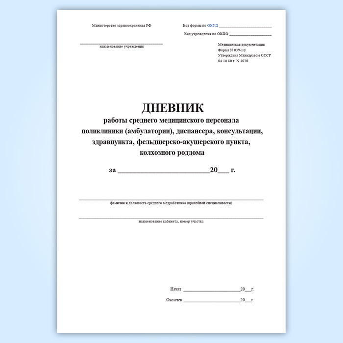 Дневник работы среднего медицинского персонала поликлиники (амбулатории), диспансера, консультации, здравпункта, фельдшерско-акушерского пункта, колхозного роддома (форма 039-1/у) в Щёлково купить