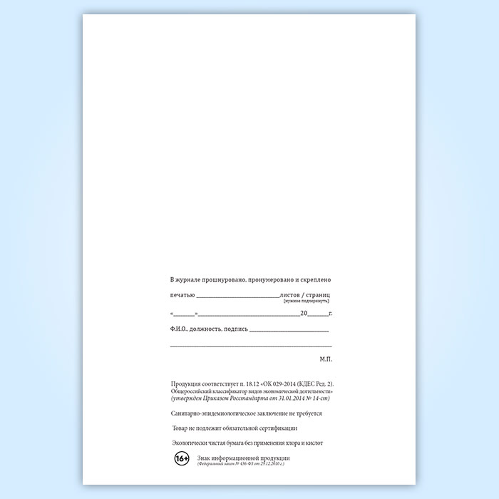 Вы получаете печатную продукцию прошнурованной и c местом для вашей печати в соответствии с действующими нормативными документами: