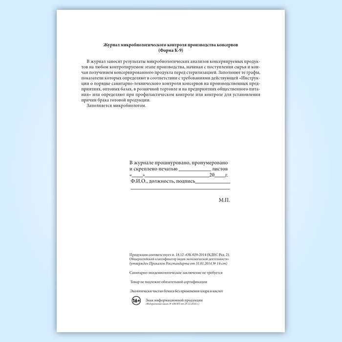Журнал микробиологического контроля производства консервов (форма К-9) в Щёлково купить