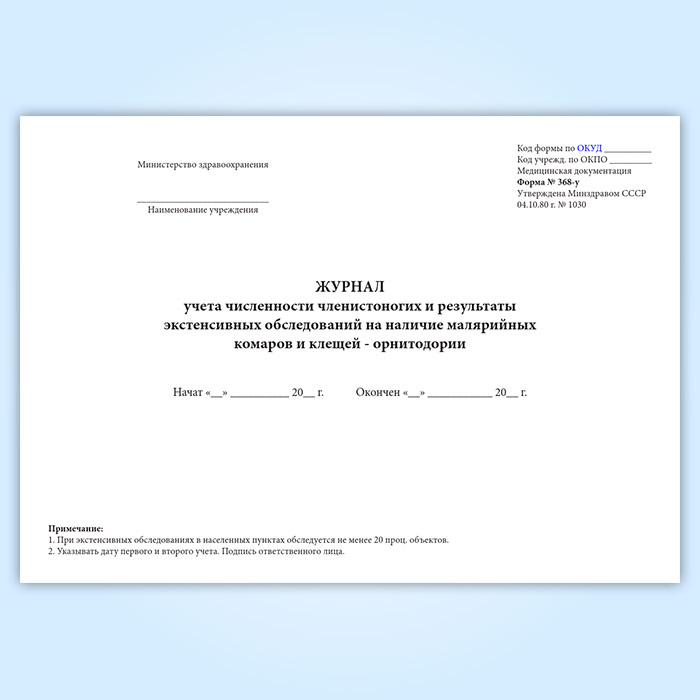 Журнал учета численности членистоногих и результаты экстенсивных обследований на наличие малярийных комаров и клещей - орнитодории (форма № 368-у) в Щёлково купить