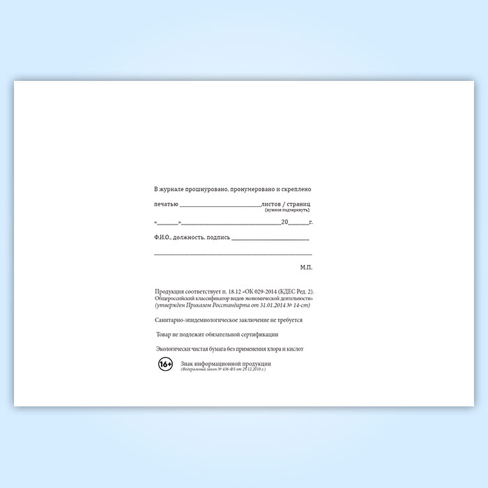 Вы получаете печатную продукцию прошнурованной и c местом для вашей печати в соответствии с действующими нормативными документами: