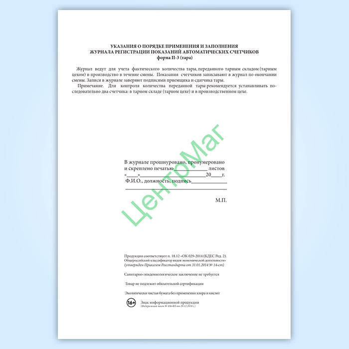 Журнал регистрации показаний автоматических счетчиков (форма № П-3 тара) в Щёлково купить