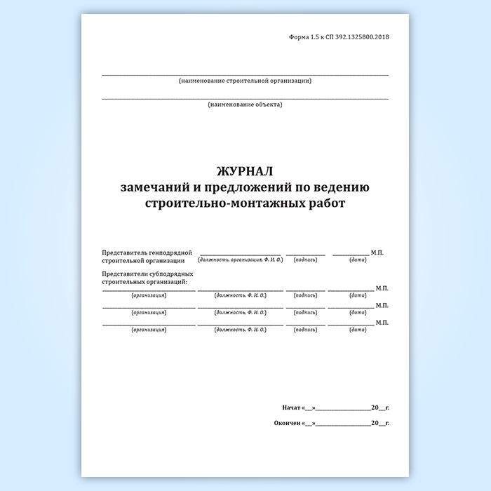 Журнал замечаний и предложений по ведению строительно-монтажных работ (форма 1.5, СП 392.1325800.2018) в Щёлково купить