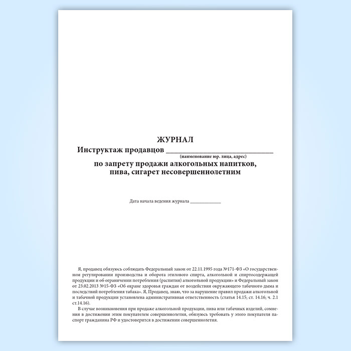 Журнал инструктажа продавцов по запрету продажи алкогольных напитков, пива, сигарет несовершеннолетним в Щёлково купить