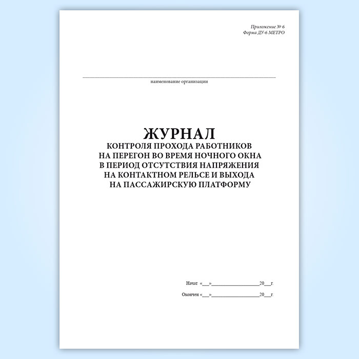 Журнал контроля прохода работников на перегон во время ночного окна в период отсутствия напряжения на контактном рельсе и выхода на пассажирскую платформу (форма ДУ-6 МЕТРО) в Щёлково купить