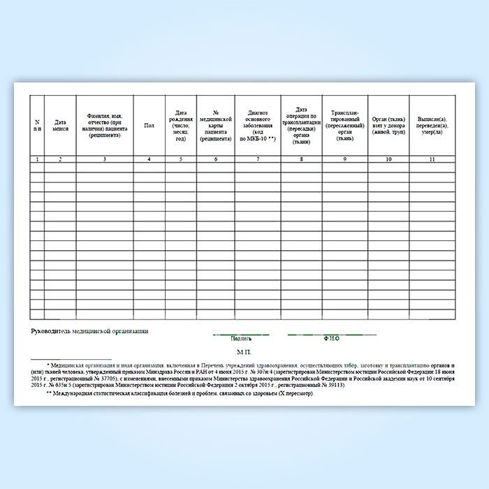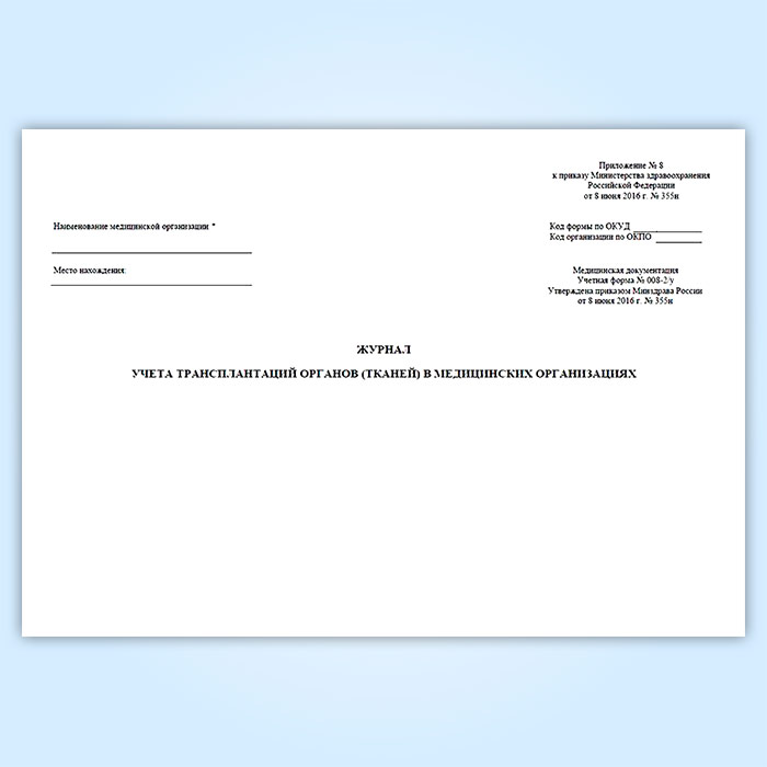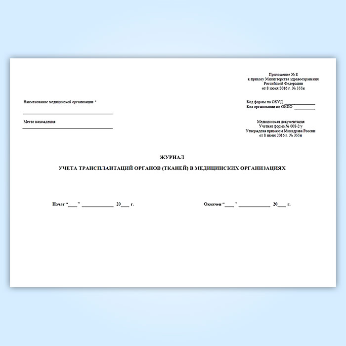 Журнал учета трансплантаций органов (тканей) в медицинских организациях (форма № 008-2/у) в Щёлково купить