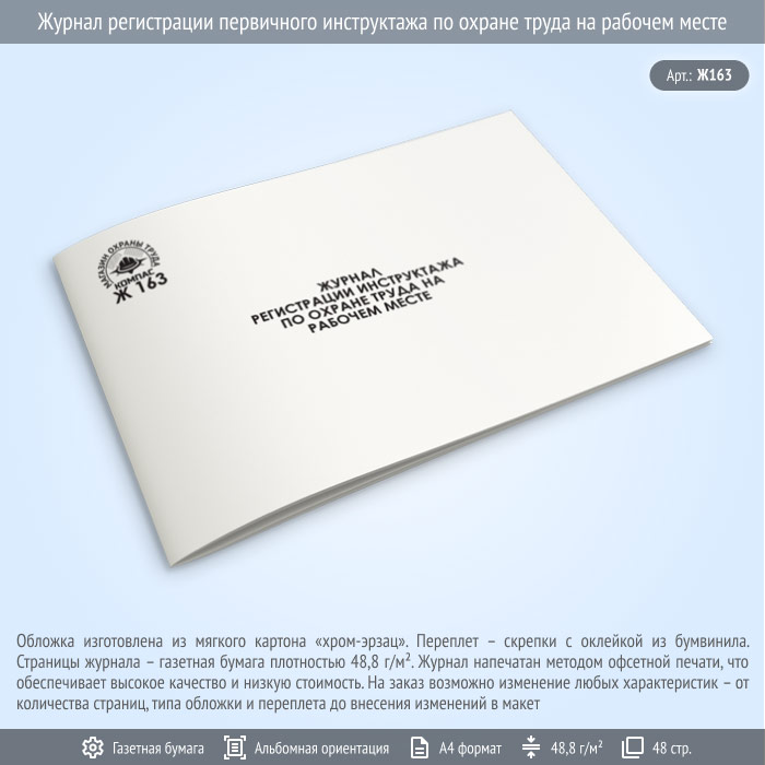 Журнал регистрации первичного инструктажа по охране труда на рабочем месте (Ж163, 48 стр.) в Щёлково купить