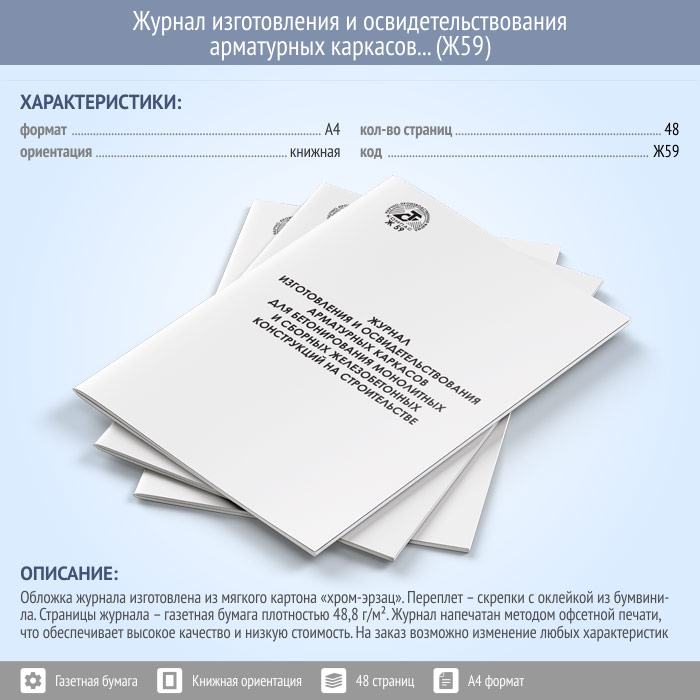 Журнал изготовления и освидетельствования арматурных каркасов для бетонирования монолитных и сборных железобетонных конструкций на строительстве (Ф-48) (48 стр., Ж59) в Щёлково купить