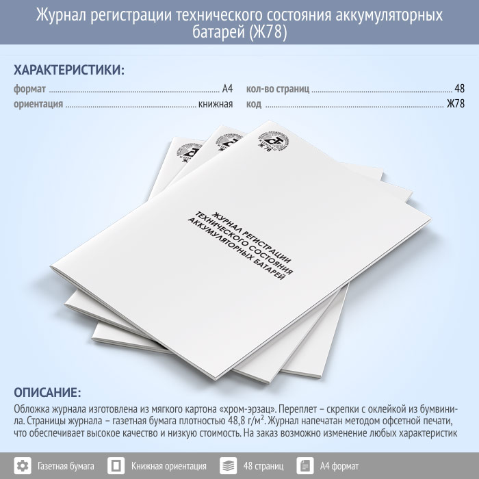 Журнал регистрации технического состояния аккумуляторных батарей (48 стр., Ж78) в Щёлково купить